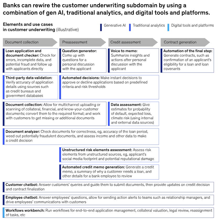 Financial institutions have already begun deploying these capabilities internally, notably in underwriting. AI systems can now ingest and analyze years of financial statements, credit reports, market data, and alternative data sources in seconds. They help surface key risk factors, highlight inconsistencies, and benchmark applicants against historical patterns across vast datasets. Rather than replacing credit officers or underwriters, these tools augment in-place capabilities by accelerating due diligence, improving consistency, and freeing up human experts to focus on judgment, structuring, and edge case evaluation.