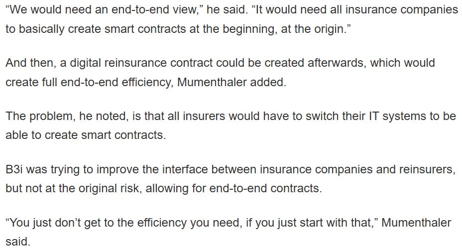 The Blockchain Insurance Industry Initiative (B3i), backed by heavyweights like Allianz and Swiss Re, aimed to revolutionize reinsurance with shared ledgers. It promised streamlined claims, accounting, and data sharing. But in 2022, B3i folded, unable to secure $20 million in funding. Why? It chased too many goals at once, was bogged down by complex governance, and failed to to prove value.