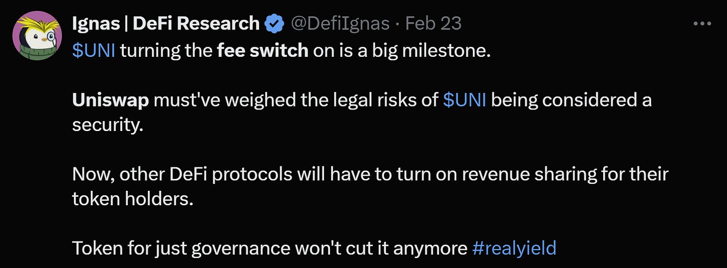 Amidst a backdrop of significant market movements and regulatory developments, the “fee switch” proposal seeks to align the interests of UNI token holders with the long-term sustainability and growth of the Uniswap Protocol. By incentivizing active governance participation through a potential revenue sharing mechanism, Uniswap aims to address the dual challenges of voter apathy and the need for more engaged community stewardship (a critical component of our last discussion of a similar proposal). However, the proposal also surfaces critical considerations regarding the balance between rewarding token holders and maintaining the essential liquidity required for trading. As the crypto landscape continues to mature, with institutional players becoming increasingly prevalent, the outcome of this proposal could set a precedent for how decentralized protocols navigate the complex interplay between governance, utility, and regulatory compliance.