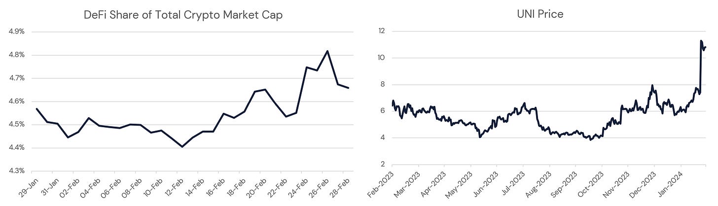 Because it was initiated by the UF, many have heralded the “fee switch” proposal as a unanimous (no pun intended) commitment of Uniswap’s core team. However, the fact that neither Hayden Adams (founder) nor Uniswap Labs (UL) acknowledged the move on social media is notable. The Foundation is a non-profit focused on governance and community, whereas UL, a commercial entity, handles protocol development and innovation. Both groups are U.S.-based where the regulatory emphasis towards tokens has been centered on whether the digital assets represent securities. Recent headlines have featured a handful of important industry wins over the SEC and while we’re still in the early days of discovery, it’s clear that the Bitcoin spot ETFs will have a meaningful impact on the crypto ecosystem and financial markets more broadly. Bringing it all together, given their critical role in overseeing the Uniswap protocol and reputation, it is likely that the UF’s proposal was carried out with consultation across the various stakeholders, prompting Blockworks research analyst Matt Fiebach to comment that “although past attempts at turning on the fee switch have failed, I am confident this time is different, and the proposal is poised to succeed.”